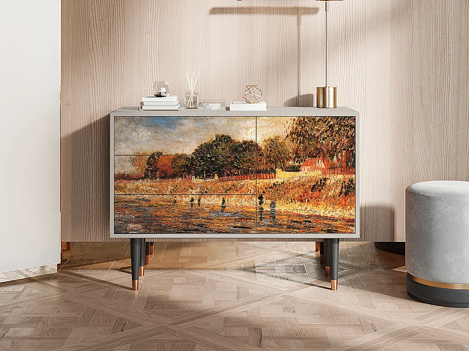 Modernes Sideboard mit Kunstmotiv, 96x110x41 cm, Weiß