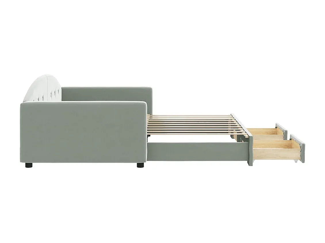 Dieses 2-in-1-Tagesbett bietet eine praktische Funktion als Sofa und zusätzliches Bett. Es lässt sich leicht in ein Doppelbett umwandeln, indem der Rollkasten ausgezogen wird. Das Bett enthält zwei Schubladen mit Rollen für Stauraum. Der Rahmen besteht aus Holz und Metall, bezogen mit Samt.