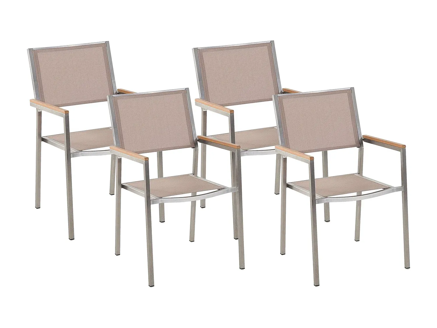Dieses Gartenstuhl-Set enthält vier Stühle mit einem robusten Edelstahlrahmen und beiger Bespannung. Die Stühle sind aus witterungsbeständigen Materialien gefertigt und verfügen über Armlehnen aus Kunstholz. Die Sitzflächen und Rückenlehnen sind mit einem schnelltrocknenden Stoff bezogen. Praktisch und stapelbar, sind sie ideal für den Außenbereich.