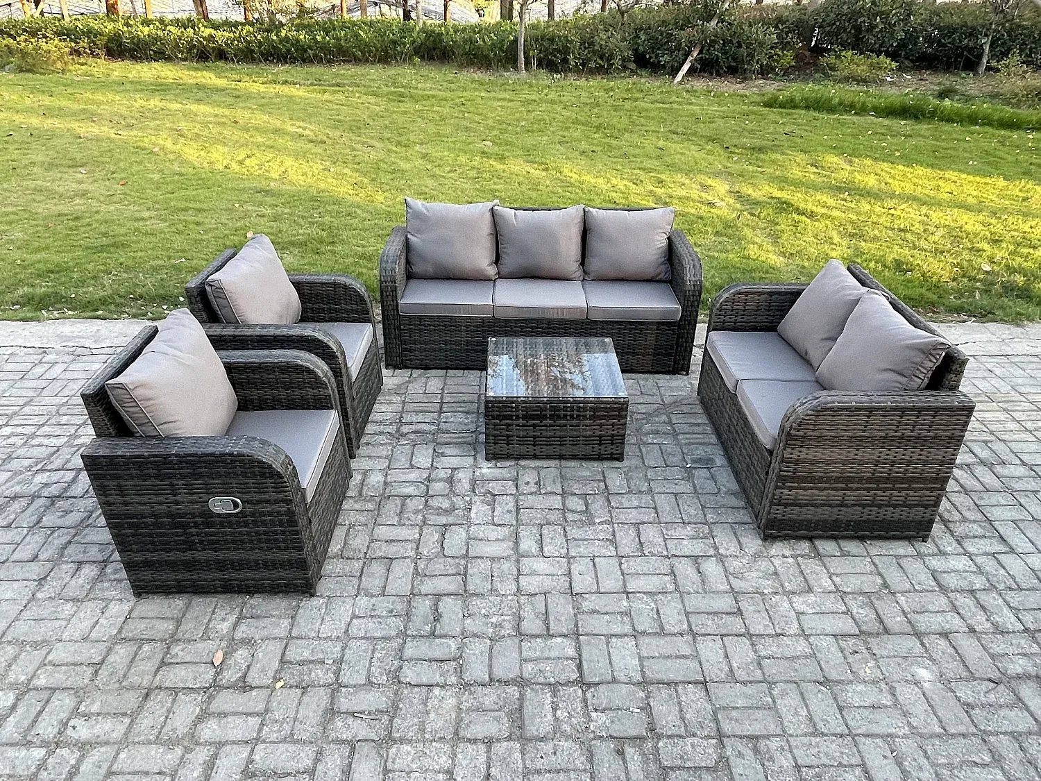 Großes Rattan Gartensofa-Set mit Glastisch, Dunkelgrau