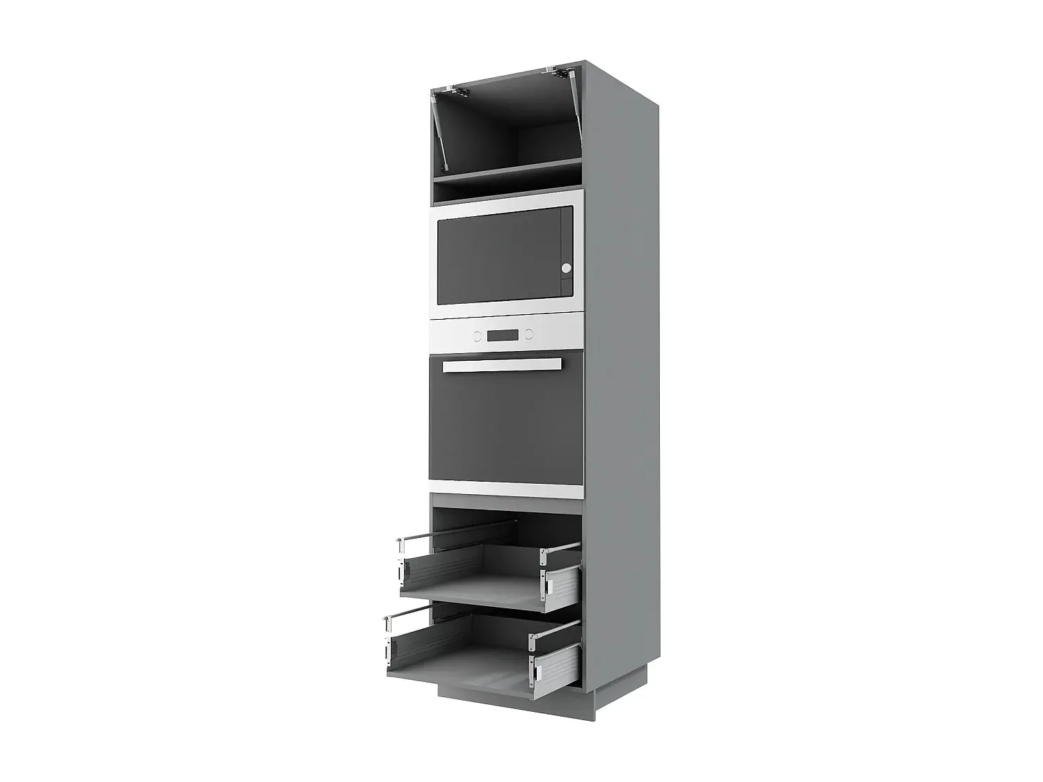 Dieser Küchenhochschrank kann individuell kombiniert werden und dient zur Erweiterung Ihrer Küchenzeile. Ausgestattet mit einer farblich passenden Sockelleiste und einstellbaren Füßen. Türen und Schubladen sind mit Soft-Close-Funktion ausgestattet. Die Schubladen verfügen über das Blum Metabox System mit Teilauszug und lassen sich bis zu zwei Drittel ausziehen. Die Fronten sind in Höhe und Neigung individuell einstellbar. Die Metabox-Schubladen mit Airtic-System ermöglichen ein geräuschloses Schließen. Korpus und Fronten sind in verschiedenen Matt-Tönen erhältlich. Abmessungen: Breite 60 cm, Tiefe 59 cm, Höhe 207 cm. Der Schrank bietet oben ein Fach mit Klapptür und darunter zwei Fächer für Einbaugeräte. Unten befinden sich zwei Schubladen mit Selbsteinzug. Die Griffe sind aus Metall mit Chromglanz. Der Schrank bietet eine maximale Belastung der festen Böden von 15 kg und der Schubladen von 30 kg. Material des Korpus ist eine Faserplatte mit Kunststoffoberfläche, die Front ist aus MDF. Ergänzen Sie Ihre Küche nach Ihren Vorstellungen.