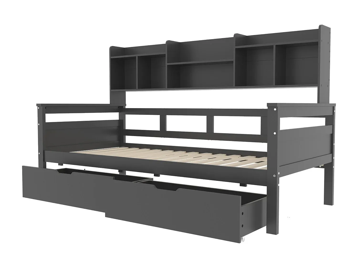 Dieses Schlafsofa vereint die Funktionen eines Sofas und eines Einzelbetts und eignet sich für verschiedene Raumtypen. Es besteht aus Massivholz und ist mit einem stabilen Lattenrost ausgestattet, um die notwendige Unterstützung zu bieten. Zwei Schubladen und mehrere seitliche Ablagefächer ermöglichen eine einfache Aufbewahrung von Kleidung, Spielzeug und Büchern. Die Graue Farbe passt sich leicht an verschiedene Einrichtungsstile an.