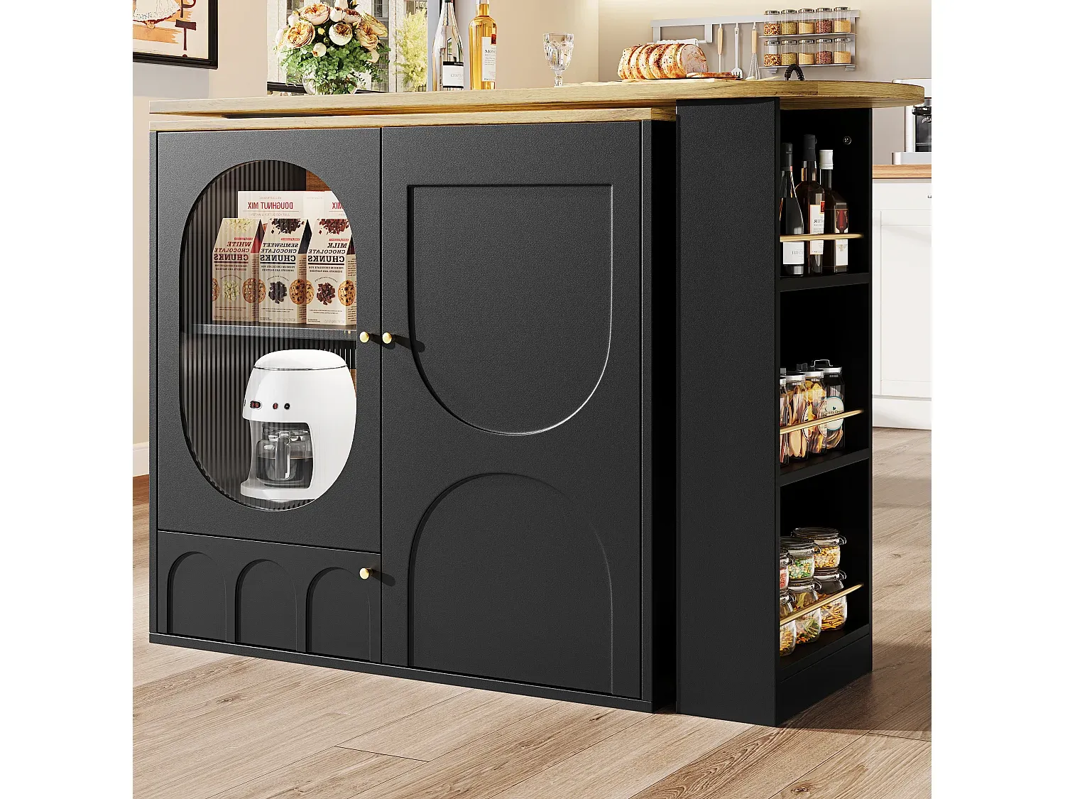 Große Aufbewahrungsmöglichkeiten mit einem dreistufigen System auf der Seite. Die Möbel verfügen über Türen mit gerahmten Paneelen und abnehmbaren Regalen für Ordnung. Der drehbare Tisch ist um 360 Grad drehbar und eignet sich für verschiedene Räume. Die Griffe aus Zinklegierung und Regale aus Stahlrohr bieten Stabilität. Eine Tür hat integriertes Glas und das Holzdesign passt gut in jedes Zuhause.