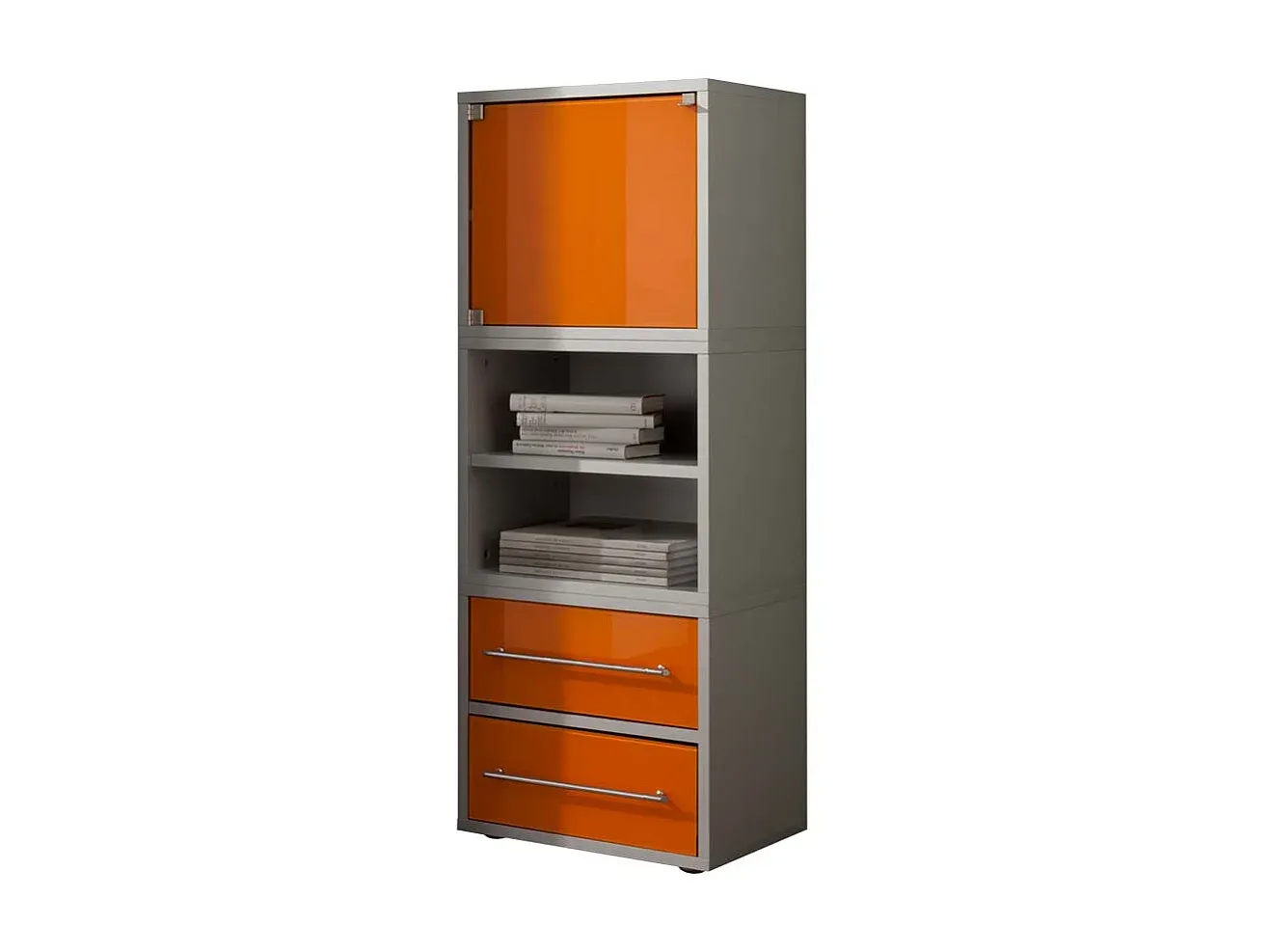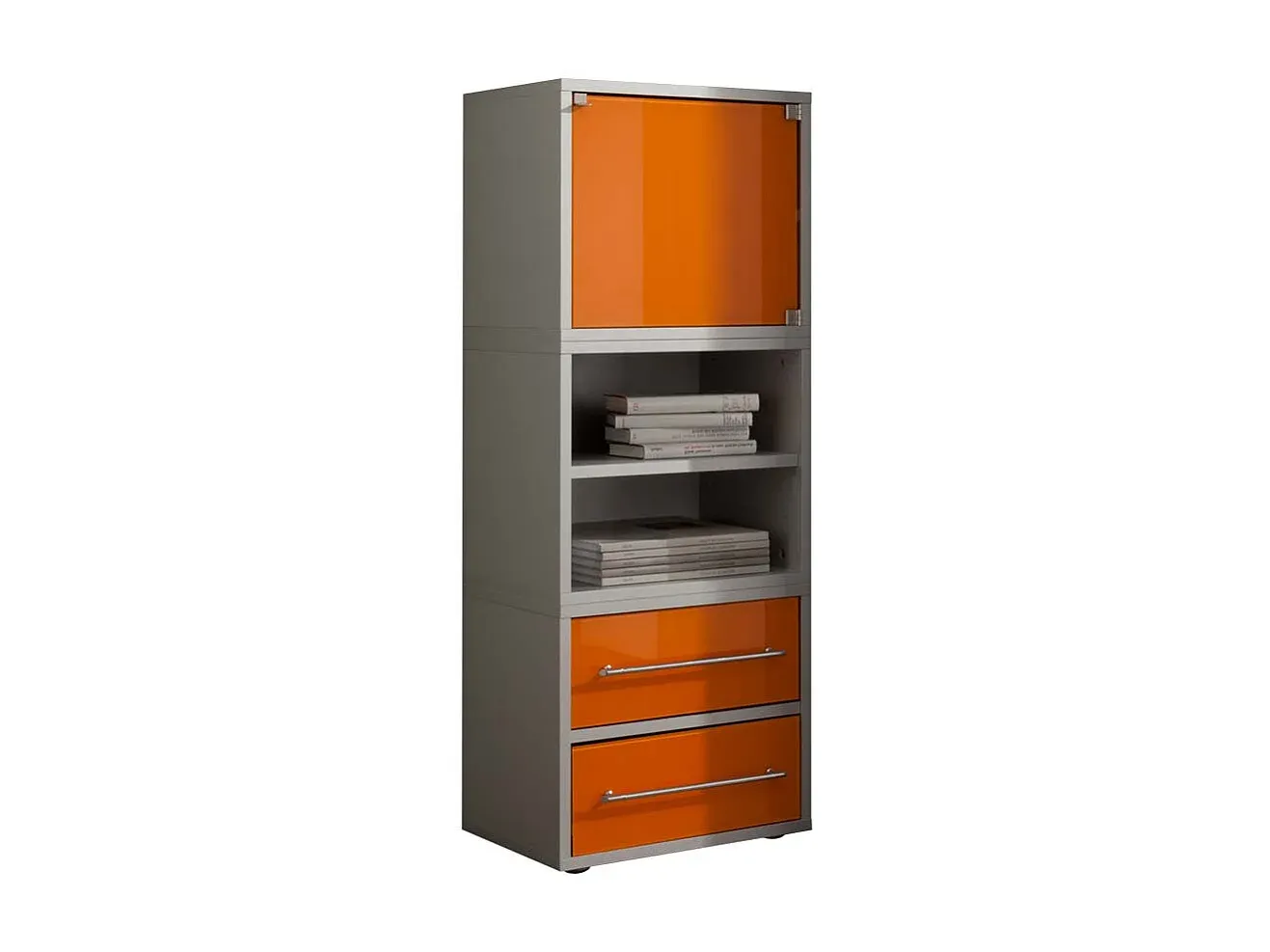 Diese Bürokommode bietet Stauraum durch Einlegeböden und zwei Schubladen mit Metallauszug. Sie ist rechteckig gestaltet und mit Metallgriffen versehen. Die Kommode besteht aus melaminbeschichteter Spanplatte und ist in den Farben Grau und Orange erhältlich. Der Türanschlag kann beidseitig montiert werden. Maße: 45 cm Breite, 120 cm Höhe, 35 cm Tiefe. Das Produkt ist für den Selbstaufbau geeignet.