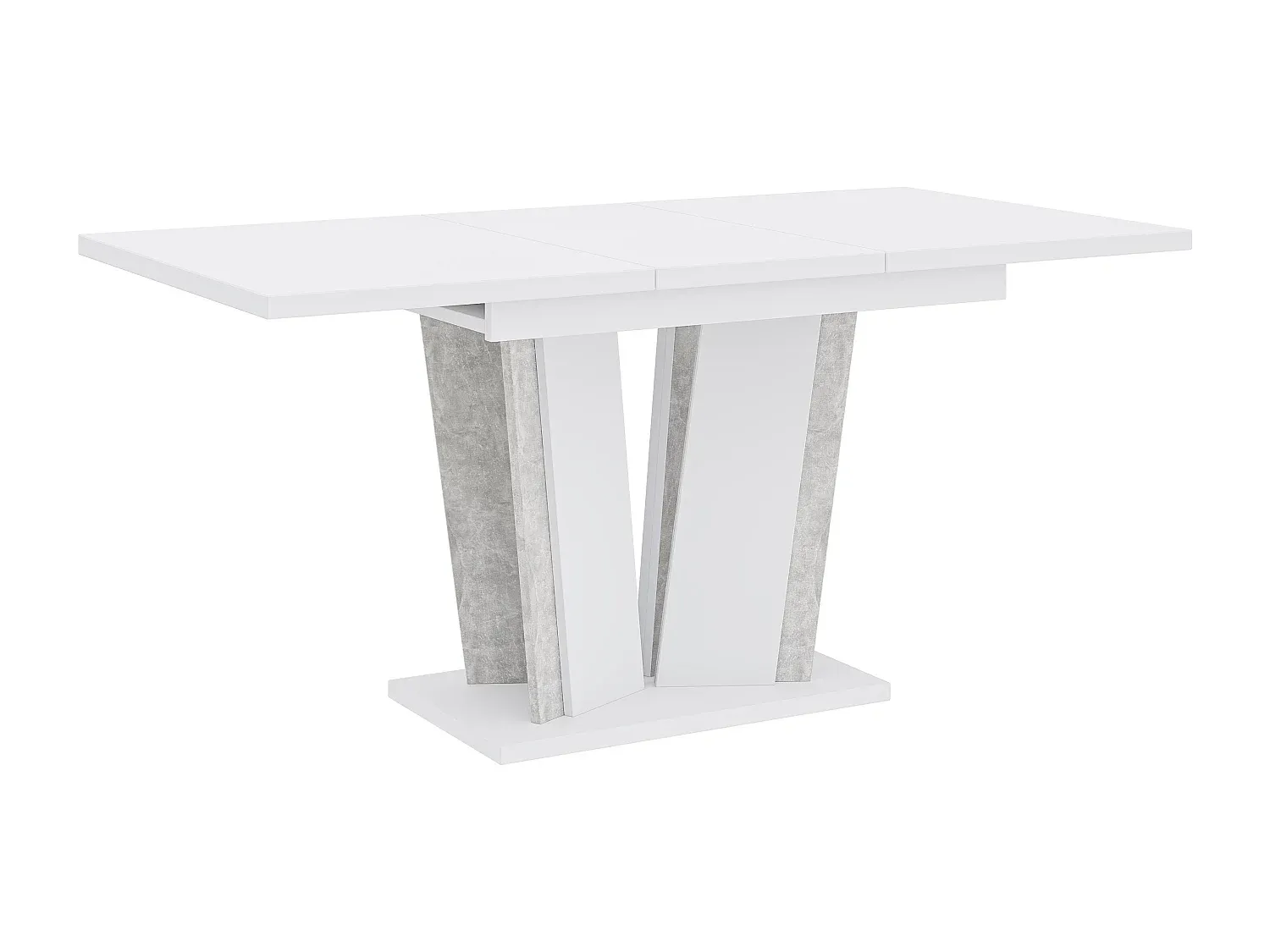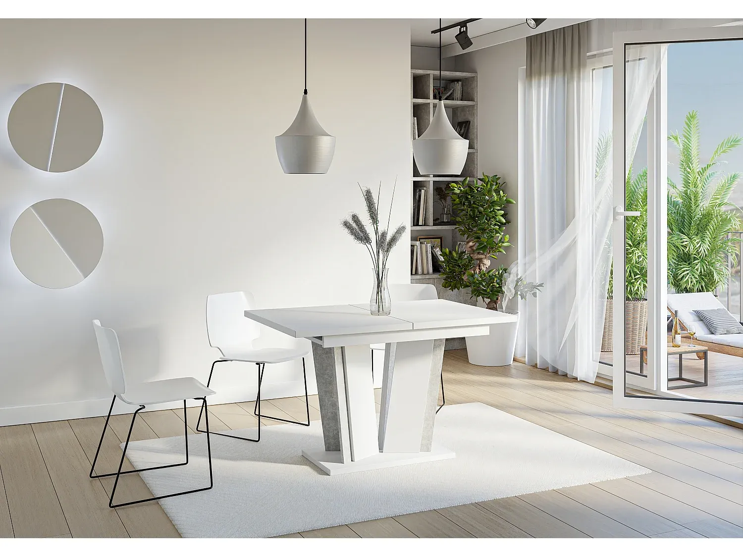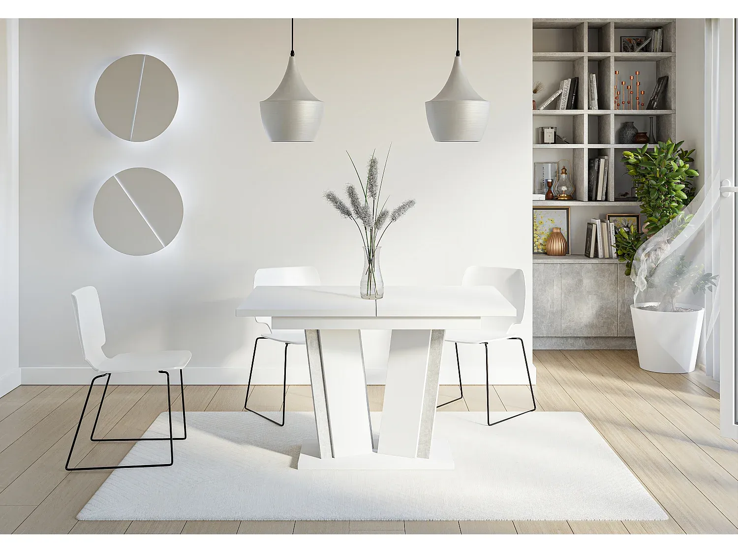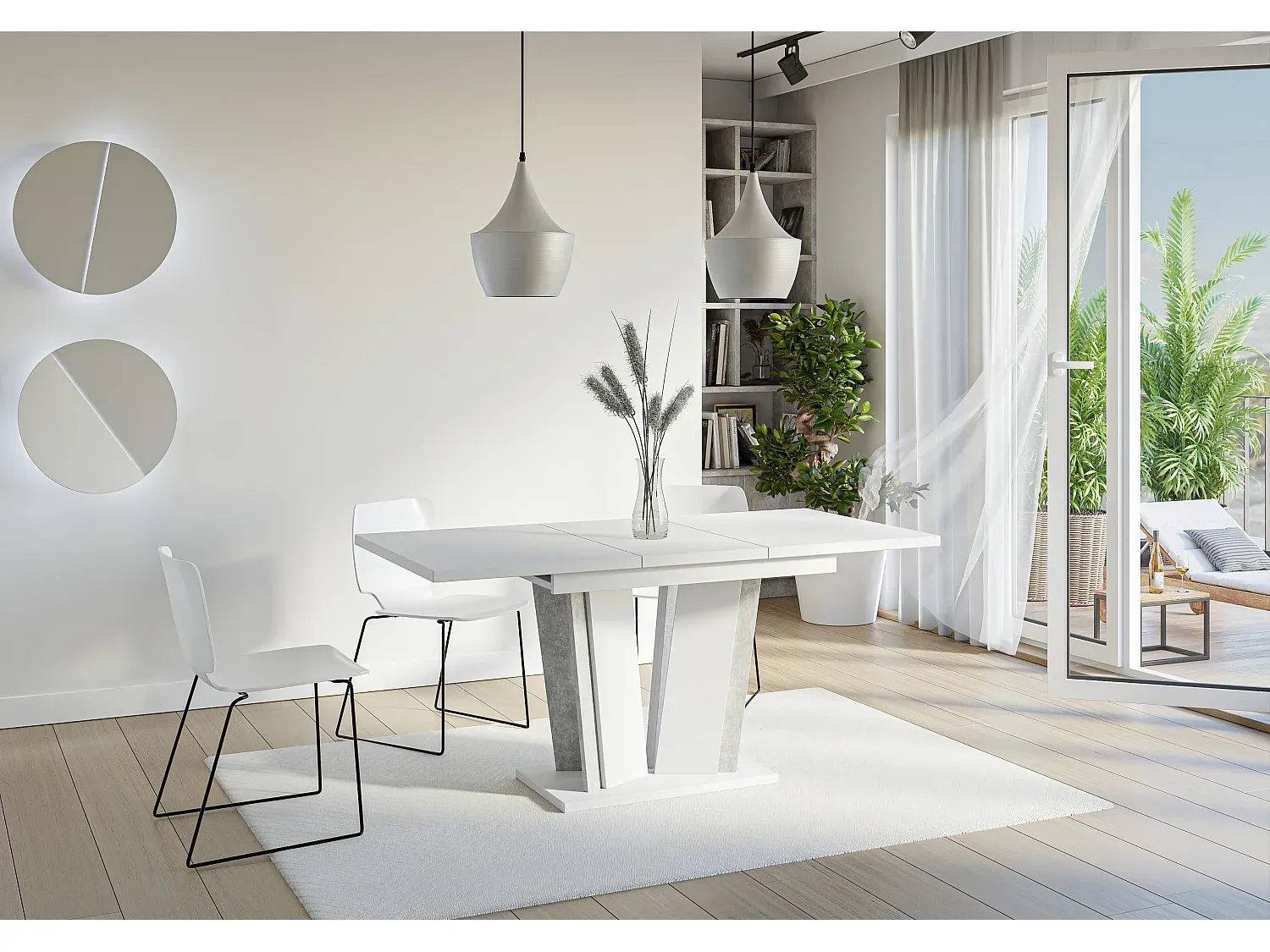 Der ausziehbare rechteckige Esstisch mit den Maßen 120 x 80 x 75 cm kann bei Bedarf auf 160 cm verlängert werden. Geeignet für verschiedene Raumgrößen, bietet er Platz für bis zu 6 Personen. Das massive Säulengestell sorgt für Stabilität und verbindet Funktionalität mit einem schlichten, geometrischen Stil. Der Tisch kann in Küchen und Esszimmern vielseitig eingesetzt werden und passt zu modernen und minimalistischen Einrichtungsstilen. Die Tischplatte hat eine Stärke von 3,2 cm und besteht aus einer laminierten Möbelplatte. Zur Selbstmontage geeignet.