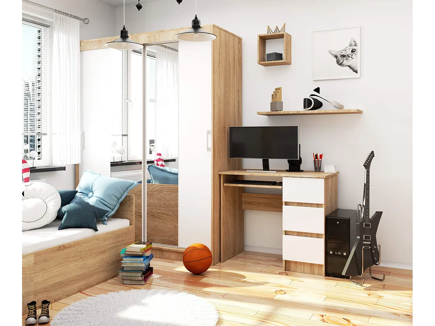 Dieser Schreibtisch in Sonoma-Eiche bietet eine praktische Arbeitsfläche von 90 cm Breite. Aus laminatbeschichtetem Holz gefertigt, ist er robust und verfügt über ABS-Kanten. Drei Schubladen und eine ausziehbare Tastaturablage sorgen für zusätzlichen Platz. Die Schubladen bieten Stauraum für Unterlagen und Büromaterialien. Der Schreibtisch hat eine matte weiße Front und ist leicht zu reinigen. Er ist für Rechts- und Linkshänder geeignet und lässt sich einfach montieren. Das Material besteht aus Holzderivaten mit einer Dicke von 16 mm.