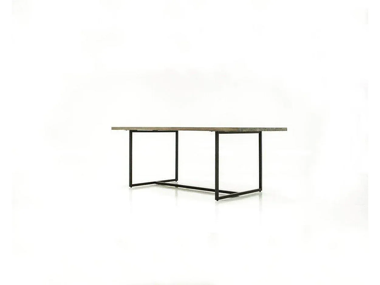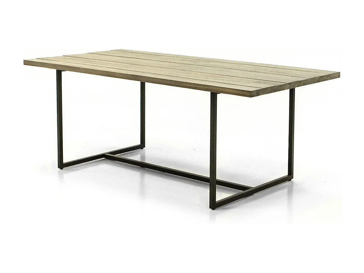 Dieser Holztisch kombiniert Akazienholz mit U-förmigen Beinen aus Metall in Graphitfarbe. Die Maße betragen 200 x 76 x 100 cm und bieten Platz für 4 Personen.