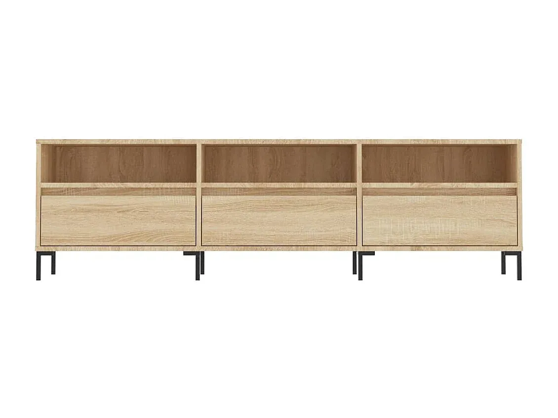 Dieser TV-Schrank bietet Stauraum und ist eine praktische Ergänzung für Wohn- oder Schlafzimmer. Das Material aus Holzwerkstoff zeichnet sich durch Festigkeit und Stabilität aus und lässt sich mit einem feuchten Tuch leicht reinigen. Mit 6 Fächern bietet dieses TV-Möbel Platz, um Zeitschriften, Bücher, DVDs und Elektronikgeräte geordnet aufzubewahren. Die Tischplatte eignet sich zum Abstellen von Büchern, Tassen und dekorativen Gegenständen. Die Beine aus Eisen verleihen dem TV-Möbel Stabilität.