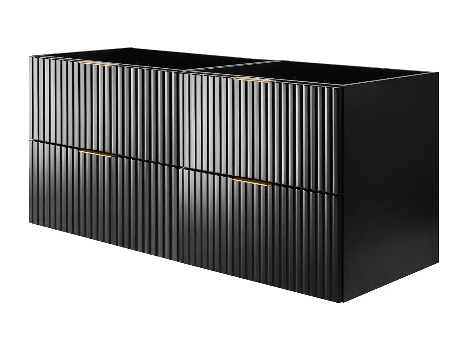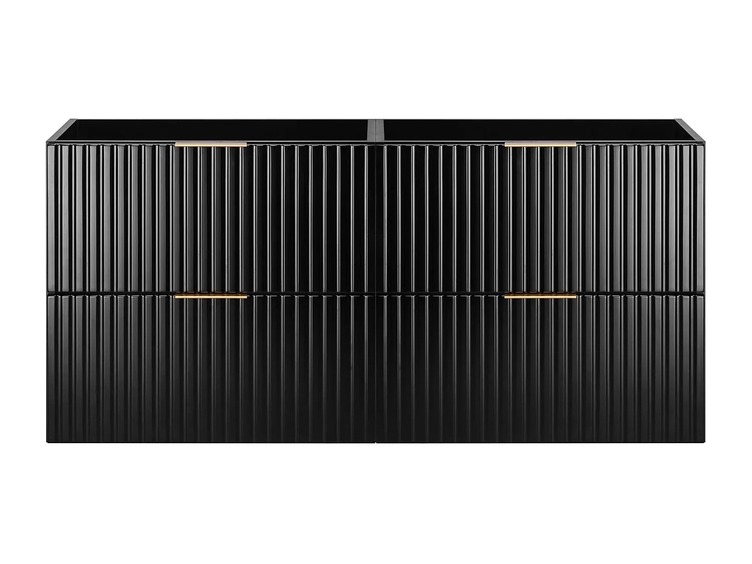 Dieser Badschrank bietet eine Kombination aus schlichtem Design und praktischen Funktionen. Mit einer Breite von 160 cm und einer mattschwarzen, geriffelten Front fügt er sich nahtlos in verschiedene Badezimmerstile ein. Die wandhängende Konstruktion erleichtert die Reinigung und maximiert den Raum. Die matte Oberfläche und Rillenstruktur sind moderne Akzente der Inneneinrichtung. Aus feuchtigkeitsbeständigen Materialien gefertigt, bietet der Schrank vier Schubladen mit Soft-Close-Funktion für leises Schließen. Eine Siphonaussparung in der oberen Schublade erleichtert den Anschluss. Drei austauschbare Griffvarianten (schwarz, gold, silber) ermöglichen individuelle Gestaltung. Hergestellt aus MDF für die Front und laminiertem Spanplattenmaterial für den Korpus.