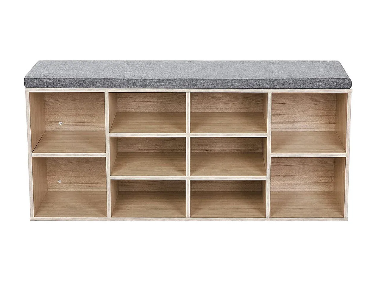 Diese Schuhbank ermöglicht bequemes Sitzen beim Anziehen. Sie ist aus stabilen Holzspanplatten gefertigt und bietet Platz für Schuhe bis Größe 44 in 30 cm tiefen Fächern. Die seitlichen Trennwände können zur Lagerung höherer Schuhe entfernt werden. Die Schaumstoffoberfläche ist mit Klettverschlüssen befestigt und kann entfernt werden, um den Schuh-Organizer auch vertikal zu nutzen. Eine detaillierte Anleitung erleichtert die Montage.