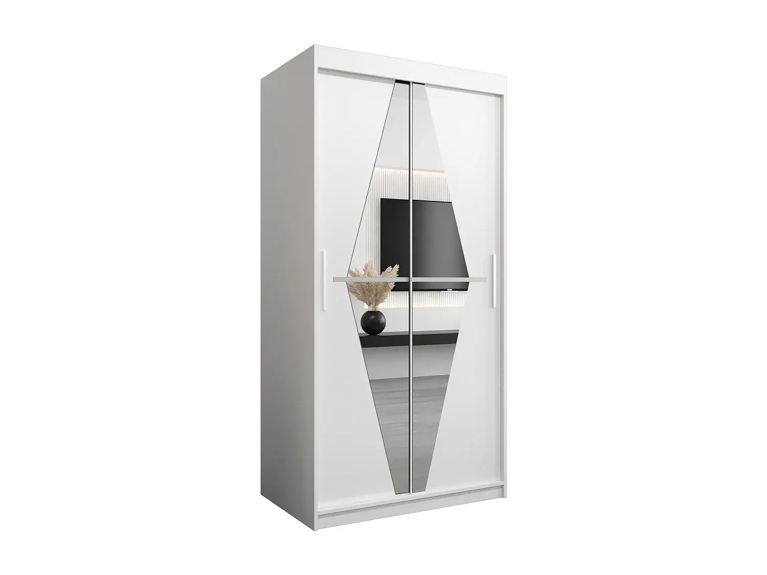 Dieser Kleiderschrank überzeugt durch ein schlichtes Design, das in viele Wohnstile integrierbar ist. Die Farboptionen erlauben eine Anpassung an verschiedene Innenräume. Der Schrank besteht aus 16 mm dickem Laminat und die Kanten sind mit 0,5 mm starkem PVC-Furnier versehen. Die Vorderseite ist mit einem Spiegel ausgestattet. Er hat Schiebetüren auf Aluminiumschienen.
