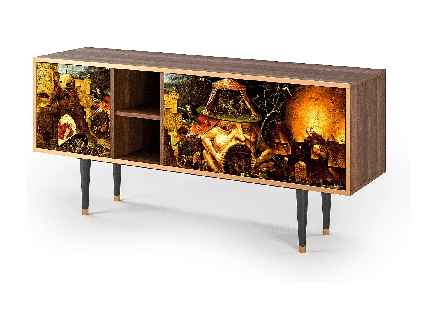 Der Schrank T5 bietet vielseitigen Stauraum mit einem geradlinigen Design. Er integriert sich nahtlos in verschiedene Einrichtungsstile. Die klaren Linien und das schlichte Design machen ihn zu einer pragmatischen Aufbewahrungslösung. Die Fronten sind präzise gefertigt und mit UV-Druck versehen, was dem Design Charakter verleiht. Die Oberfläche ist mit einem schützenden Lack versiegelt, was für Langlebigkeit sorgt. Der Schrank steht auf stabilen Holzbeinen mit Metallelementen. Er passt zu modernen, minimalistischen oder klassischen Interieurs. Maße: Breite: 150 cm, Höhe: 69 cm, Tiefe: 41 cm
