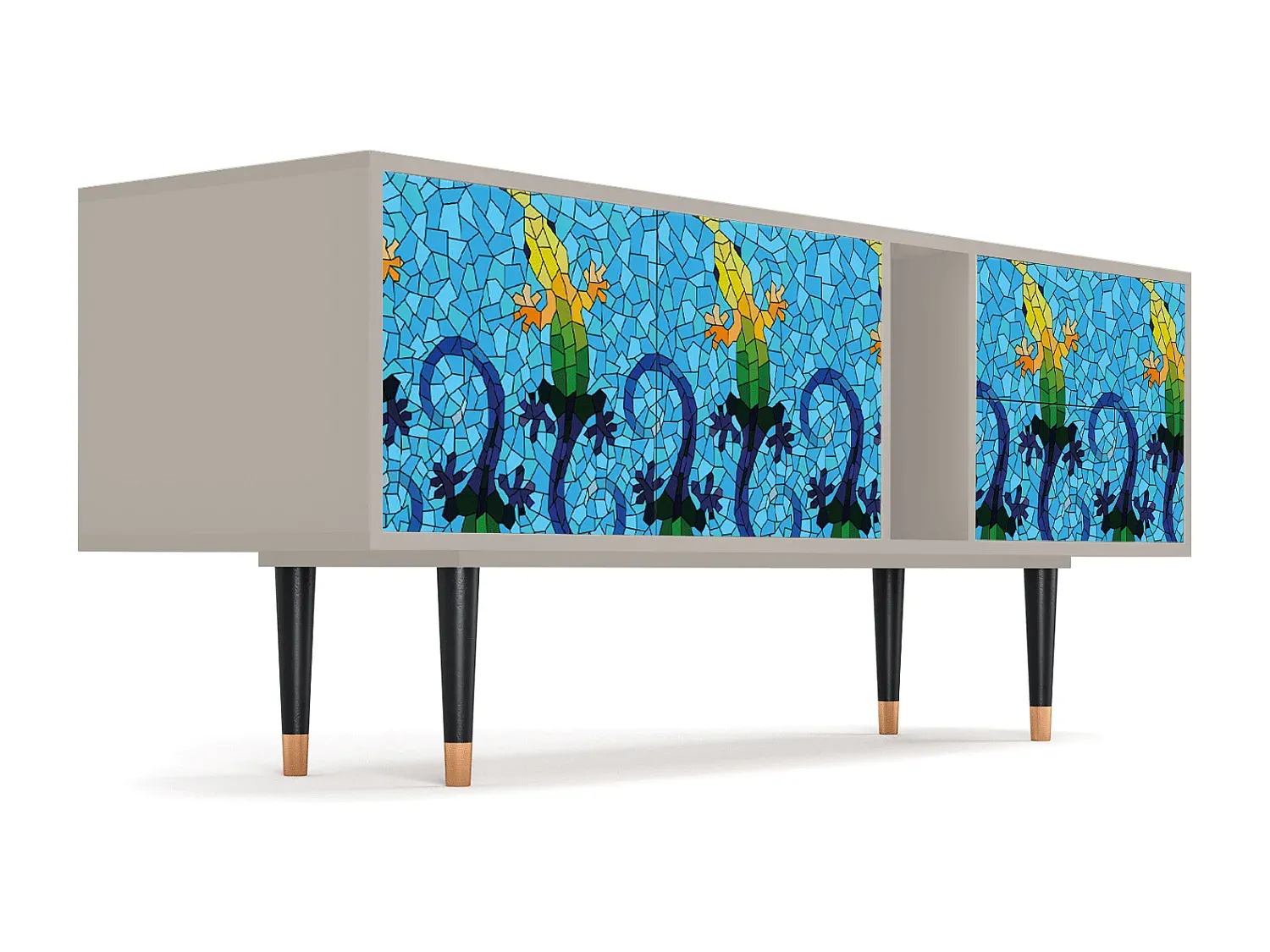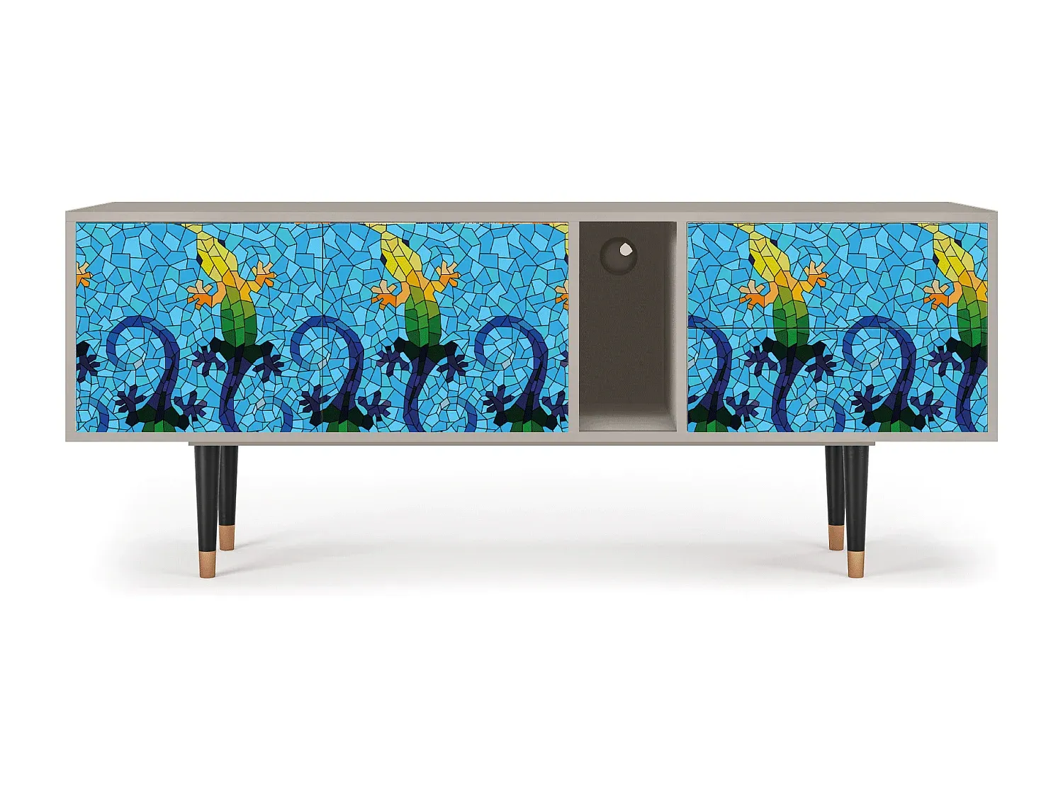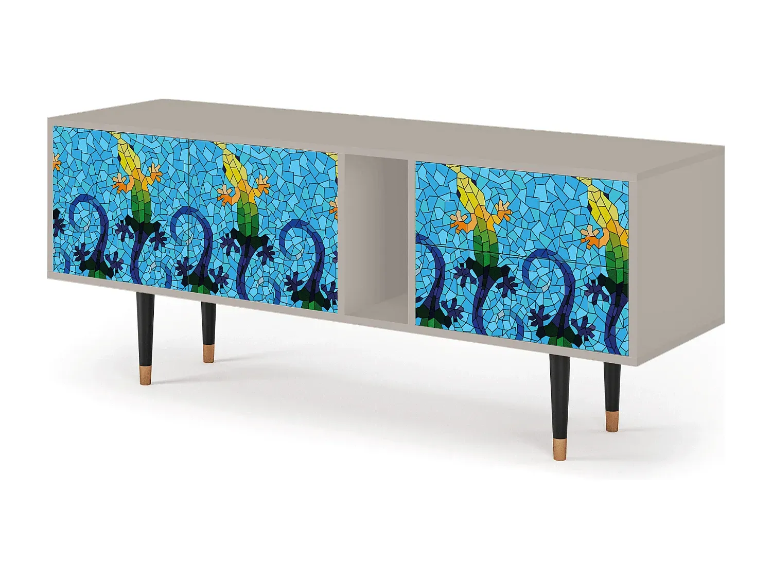 Dieses TV-Möbel dient nicht nur zur Aufbewahrung Ihrer technischen Geräte, sondern integriert sich nahtlos in Ihren Wohnraum und bietet ausreichend Platz für Fernseher, Konsolen und Zubehör. Mit klaren Linien und praktischen Aufbewahrungslösungen fügt sich das Möbelstück in moderne Umgebungen ein. Die Oberflächen sind mit einem schützenden Lack versiegelt, der vor Kratzern schützt. Es steht stabil auf Holzbeinen mit Metallelementen und passt sich verschiedenen Einrichtungsstilen an. Es sind zwei Türen und Schwingtüren vorhanden. Hergestellt in Europa. Maximale Traglast beträgt 60 kg. Maße: Breite 170 cm, Höhe 69 cm, Tiefe 48 cm.