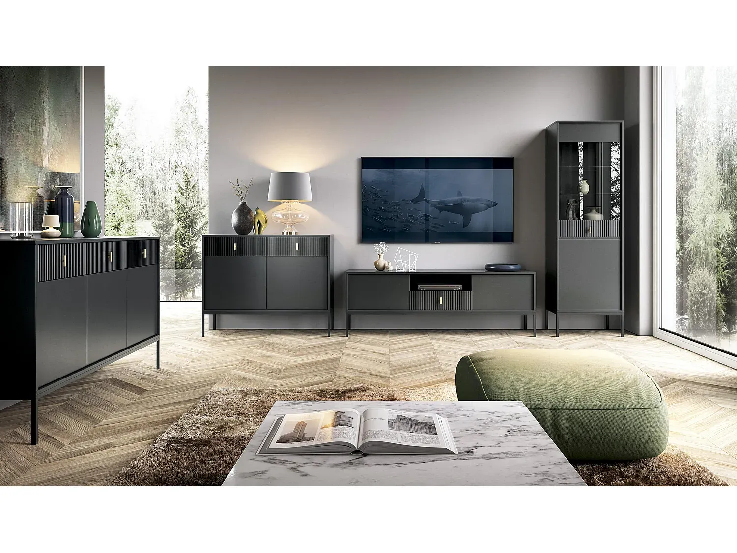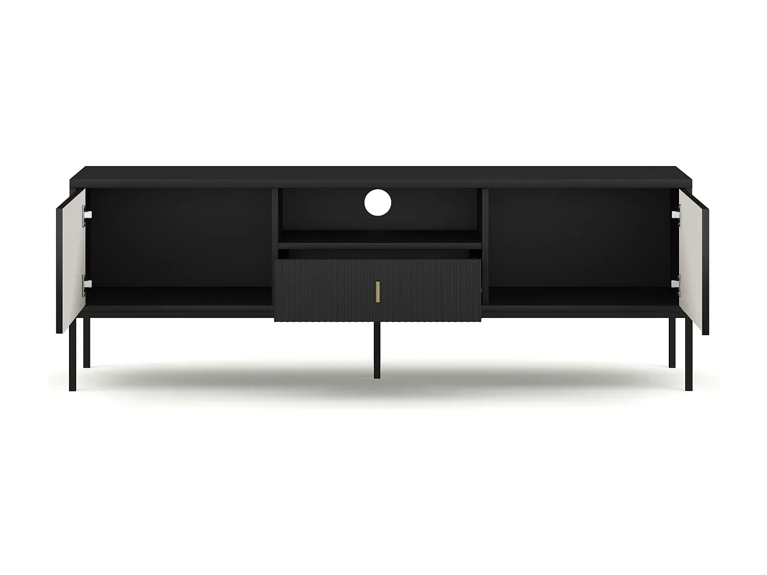 Der TV-Ständer in Schwarz besitzt ein schlichtes Design. Mit den Maßen 154x53x39 cm besteht er aus Holzwerkstoff und Stahl. Er bietet mit drei Ablagen und einer Schublade ausreichend Stauraum für Medienkomponenten. Das Design passt gut zu modernen Wohnbereichen.