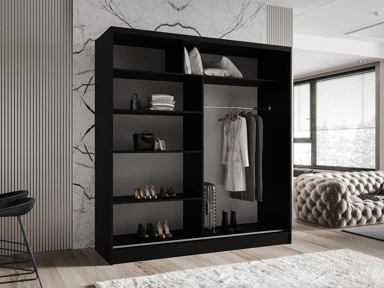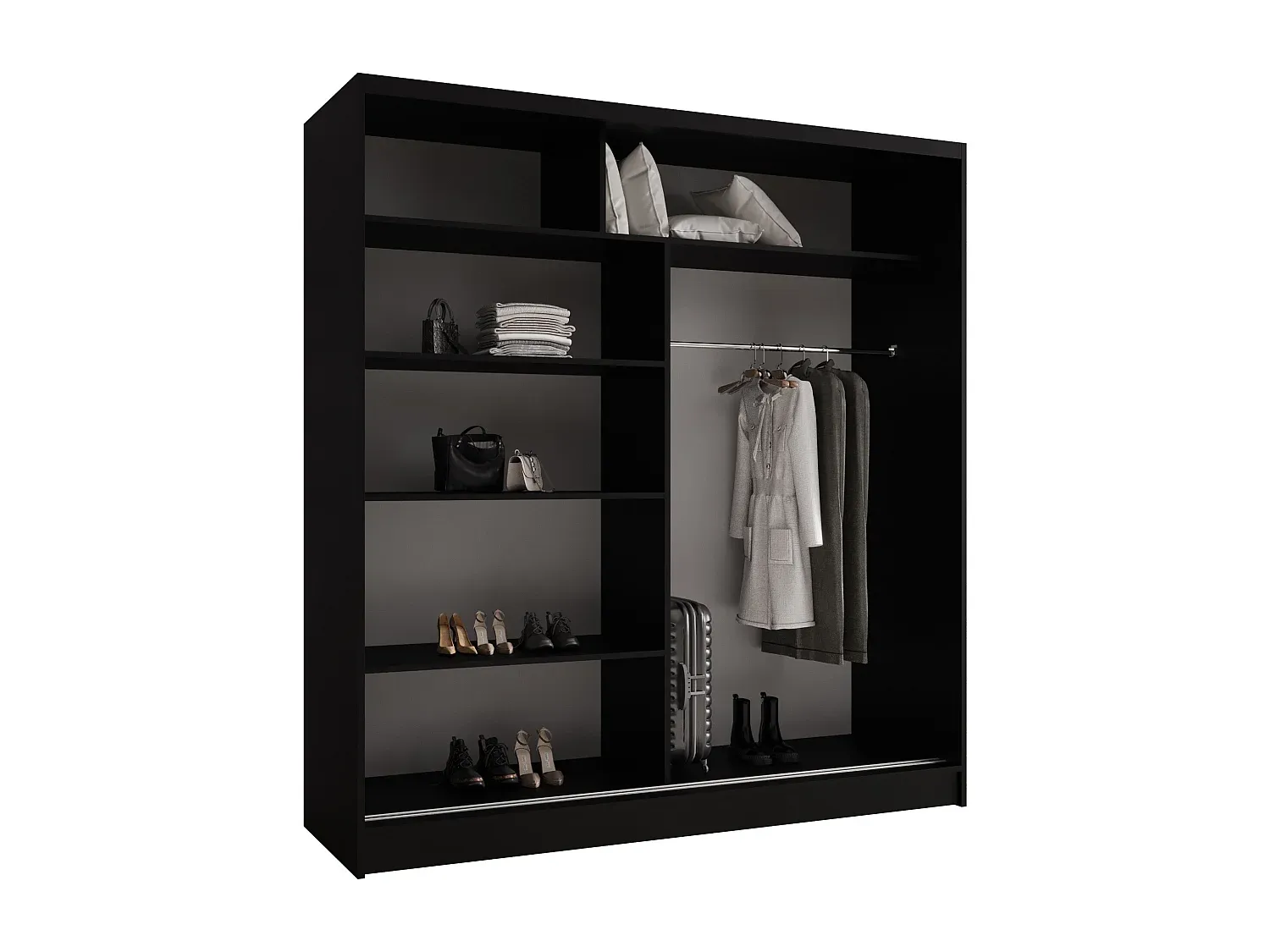 Dieser Kleiderschrank mit zwei Schiebetüren bietet eine praktische Lösung für das Schlafzimmer. Er besteht aus laminierter Platte und verfügt über eine glatte, pflegeleichte Oberfläche. Die Schiebetüren ermöglichen eine platzsparende Nutzung und lassen sich mühelos öffnen und schließen, da sie auf Aluminiumführungen gleiten. Er bietet ausreichend Stauraum für Kleidung und Accessoires. Die Türgriffe sind funktional und ergonomisch gestaltet. Ausgestattet mit einer Stange und geräumigen Regalen, passt der Schrank in verschiedene Innenräume.