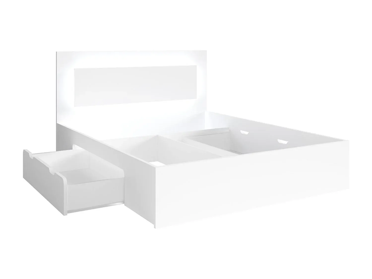 Dieses Schlafzimmer-Set umfasst ein Bett und zwei Nachtkonsolen. Das Bett verfügt über ein LED-Licht im Kopfteil und praktische Bettschubladen. Die Beleuchtung dient der Stimmung und ist in verschiedenen Größen und Farben erhältlich. Das Bett kann ohne oder mit Lattenrahmen bestellt werden. Materialien umfassen melaminharzbeschichtete Spanplatte und ABS-Kanten. Nachtkonsolen bieten je eine Schublade und ein offenes Fach. Maße und Gewichtsbelastungen sind spezifiziert.