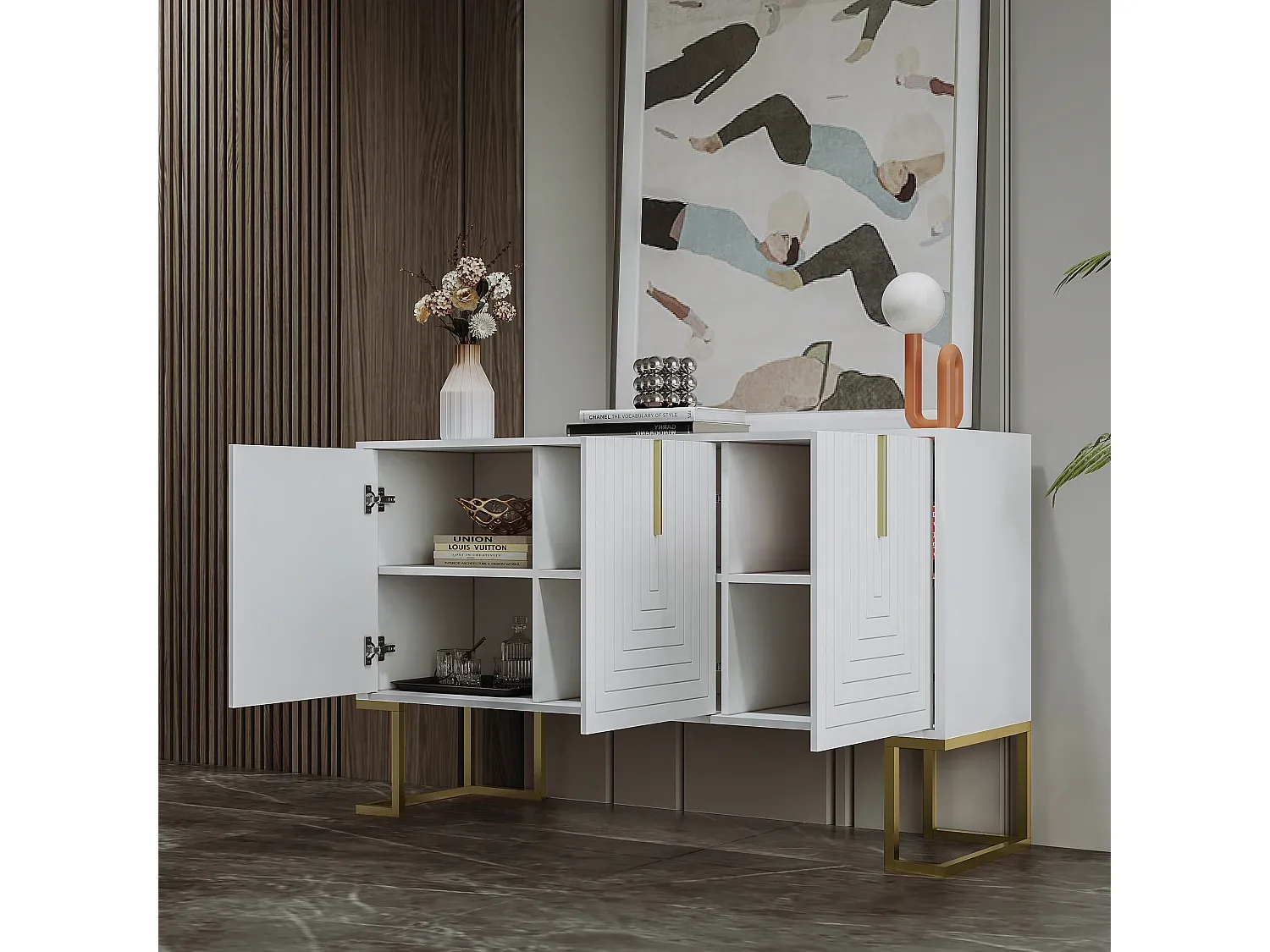 Dieses Buffet bietet Stauraum mit funktionalem Design. Es verfügt über vier Türen mit einem verstellbaren Regal pro Schrank, um vielfältige Aufbewahrungsmöglichkeiten zu schaffen. Die abgerundeten Kanten minimieren das Verletzungsrisiko. Die Türen lassen sich durch einen Druckmechanismus einfach öffnen. Die Konstruktion aus MDF und Spanplatten sorgt für Stabilität.
